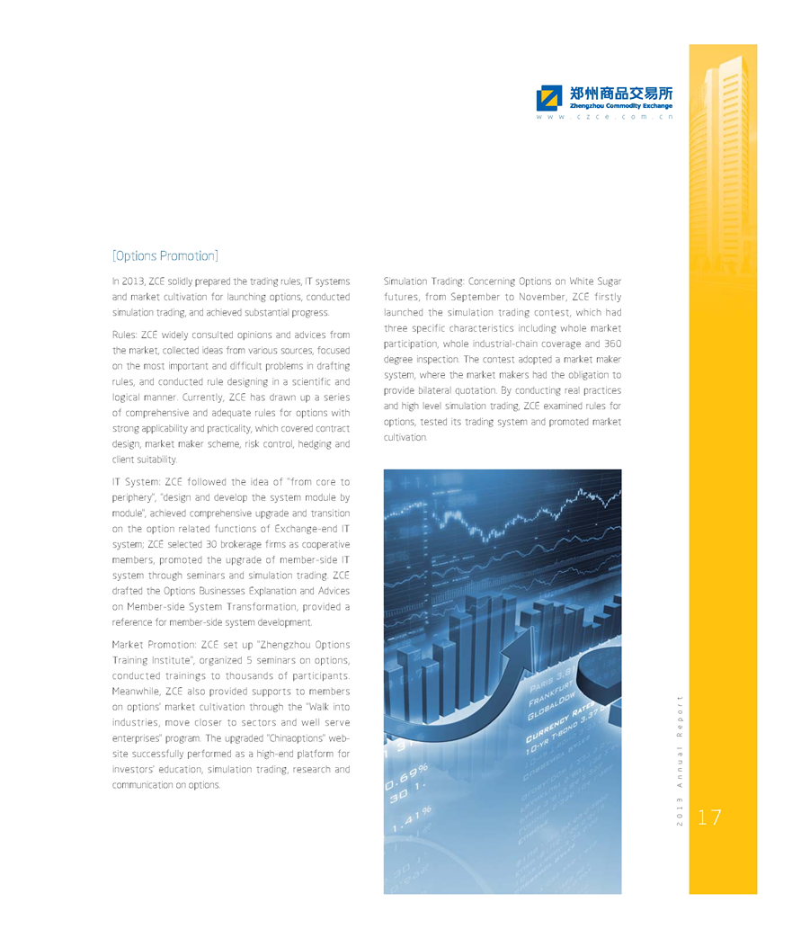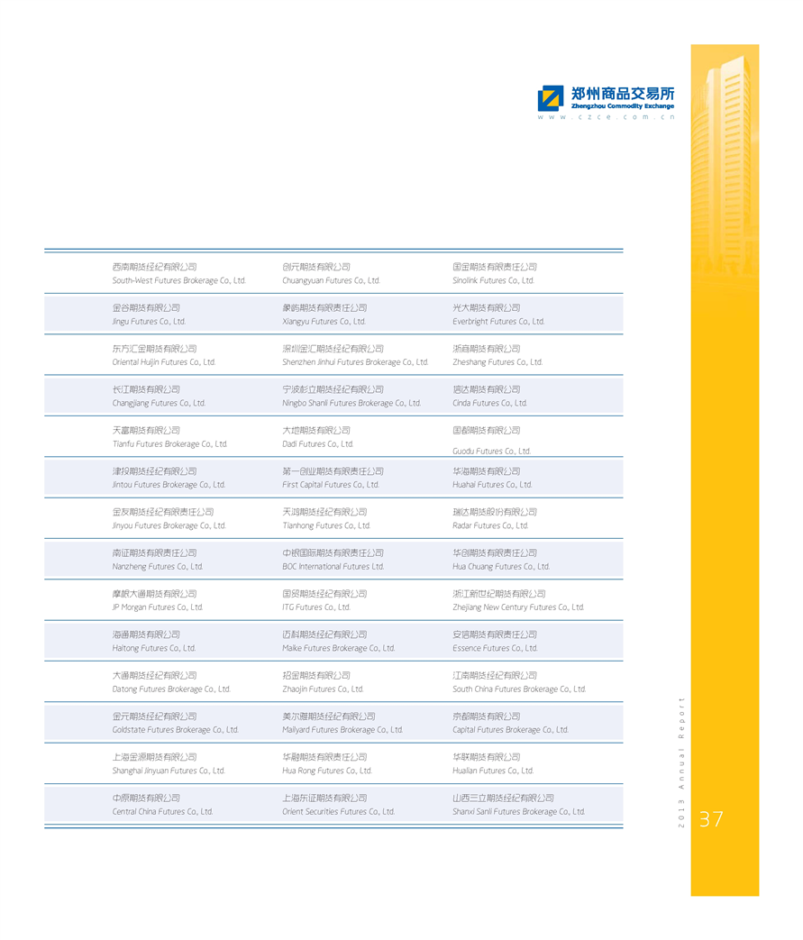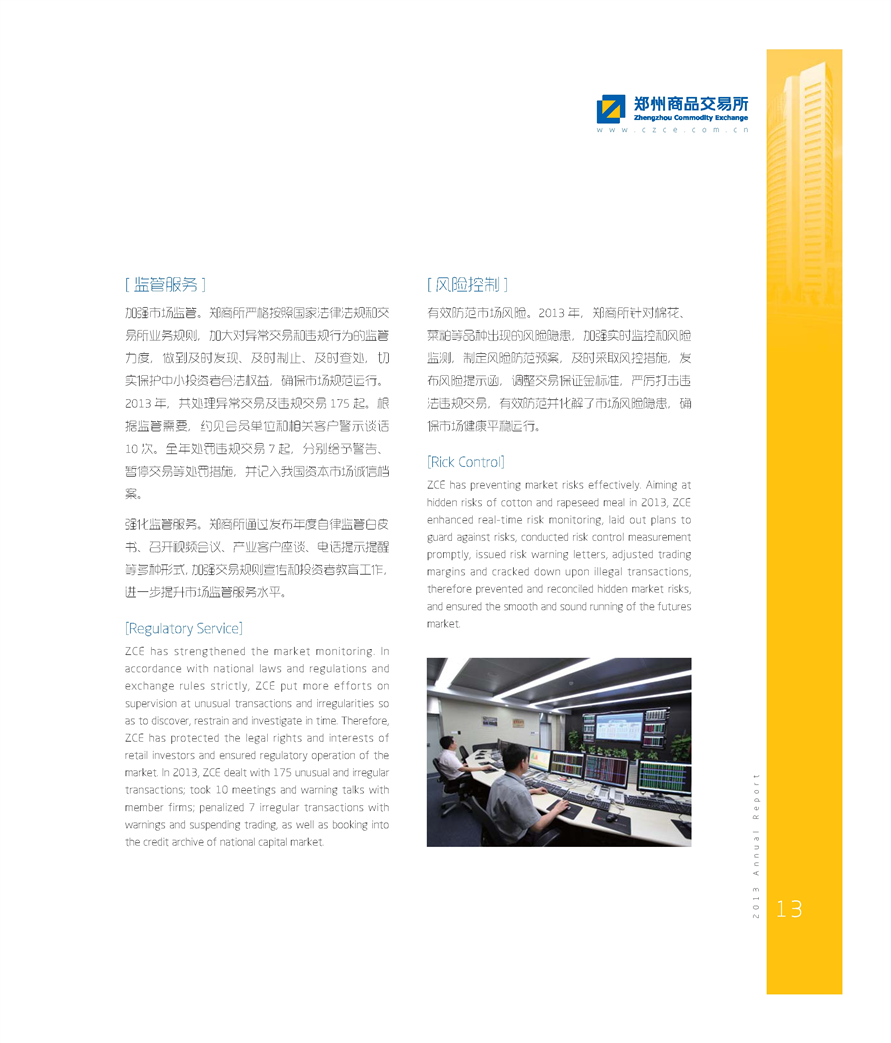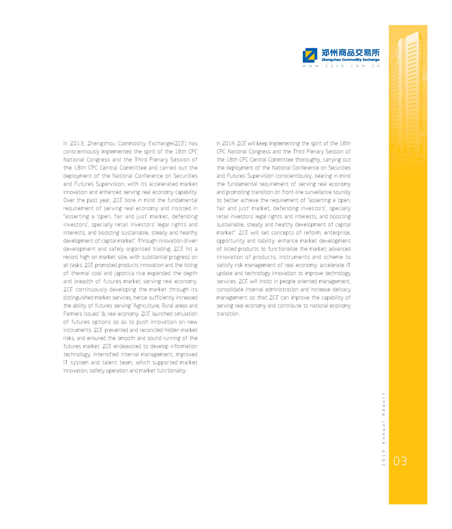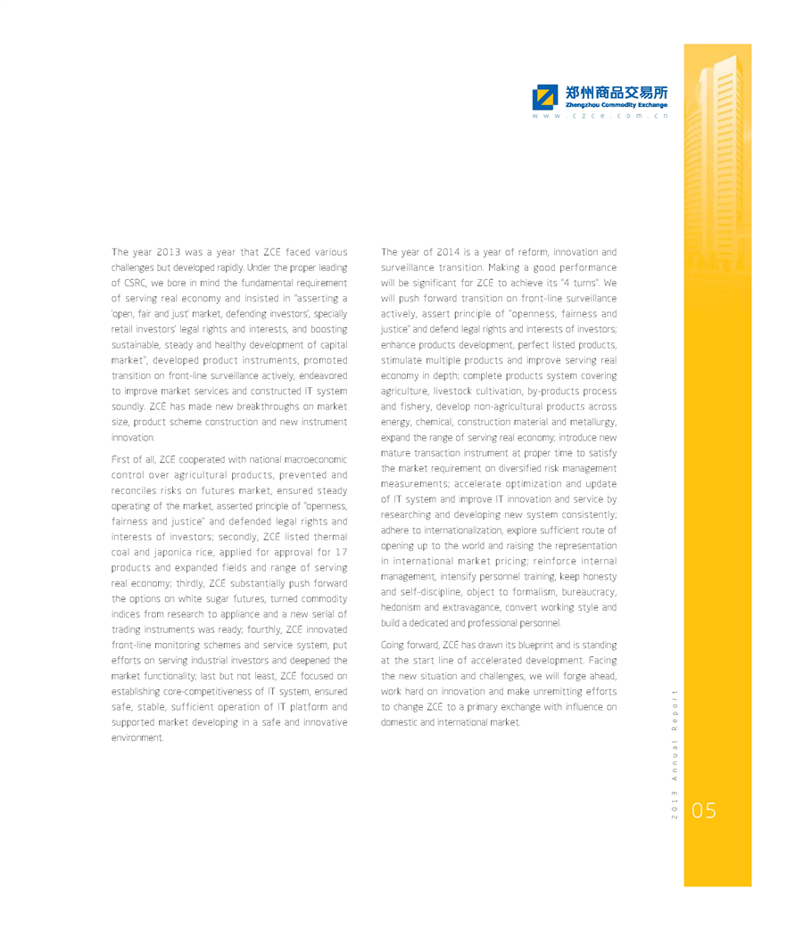 Zhengzhou Commodity Exchange (hereinafter referred to as ZCE) was founded in October, 1990. With the approval of the State Council, ZCE was established as a pilot exchange in China futures market and it is regulated by China Securities Regulatory Commission (CSRC).